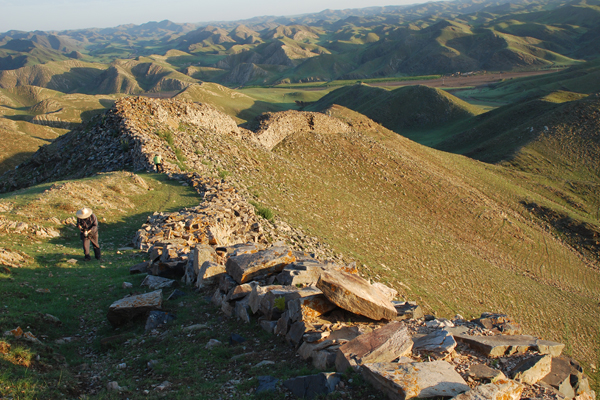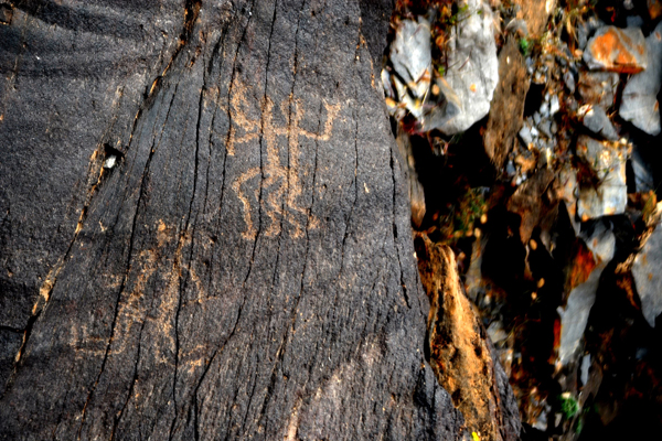 3、阴山岩画。位于小佘太秦长城北侧600-800m处。目前已发现4处共计70余幅青铜器时代的阴山岩画。岩画中刻有牧羊人、狩猎人、北山羊、猎犬、马、驴等图像,这些古老的岩画刻绘在石英脉岩石上,当地牧民称为“红墙”,它与黑色的石长城并行由东向西延伸,宛如两条黑、红色的巨龙,在阴山上缓缓舞动,增添了小佘太秦长城的吸引力和神秘感。