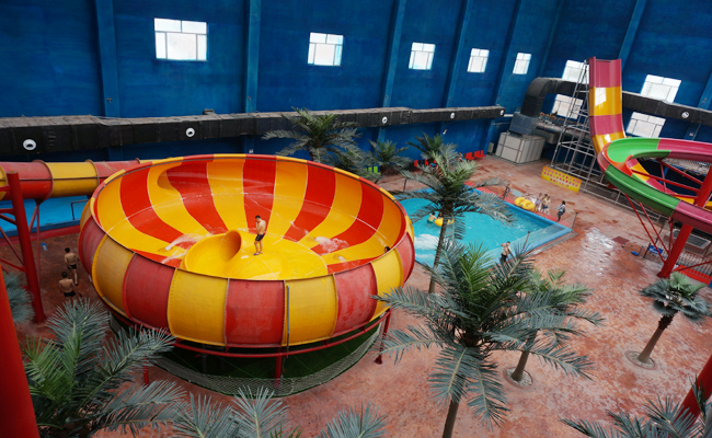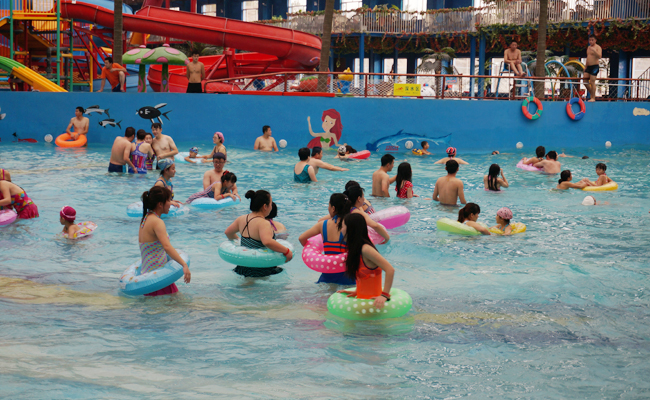 水上乐园设施包括:大喇叭、巨兽碗、冲天回旋、彩虹滑梯、儿童水寨 冲浪池、山泉水游泳池、大小17个温泉泡池、水疗池、洗浴场、沙滩运动场。场内设施适合各年龄段消费者的娱乐健身项目。水上乐园可同时接纳5000人游乐。