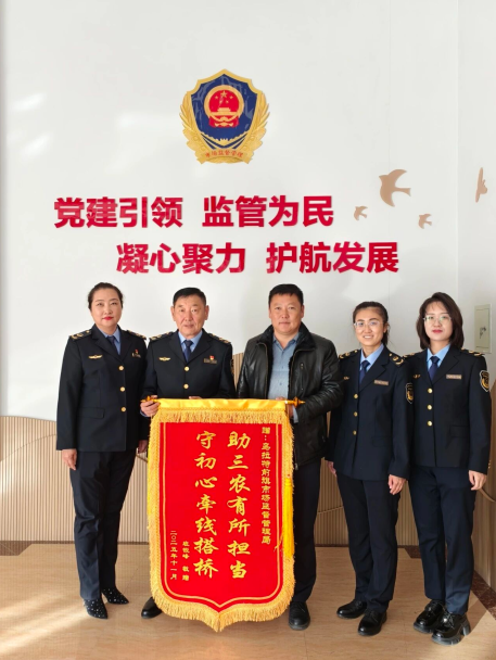 2025年11月19日,乌拉特前旗市场监督管理局迎来温馨一幕,大佘太镇一农户将一面写有“守初心牵线搭桥 助三农有所担当”的锦旗送到工作人员手中,以此感谢市监局积极协调资源,帮助其成功销售大量滞销萝卜。这面锦旗是对市监局主动作为、服务民生的最佳赞许。