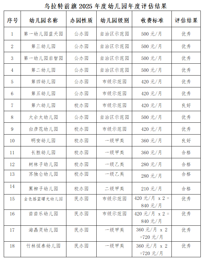乌拉特前旗2025年度幼儿园重点工作督导评估情况公示