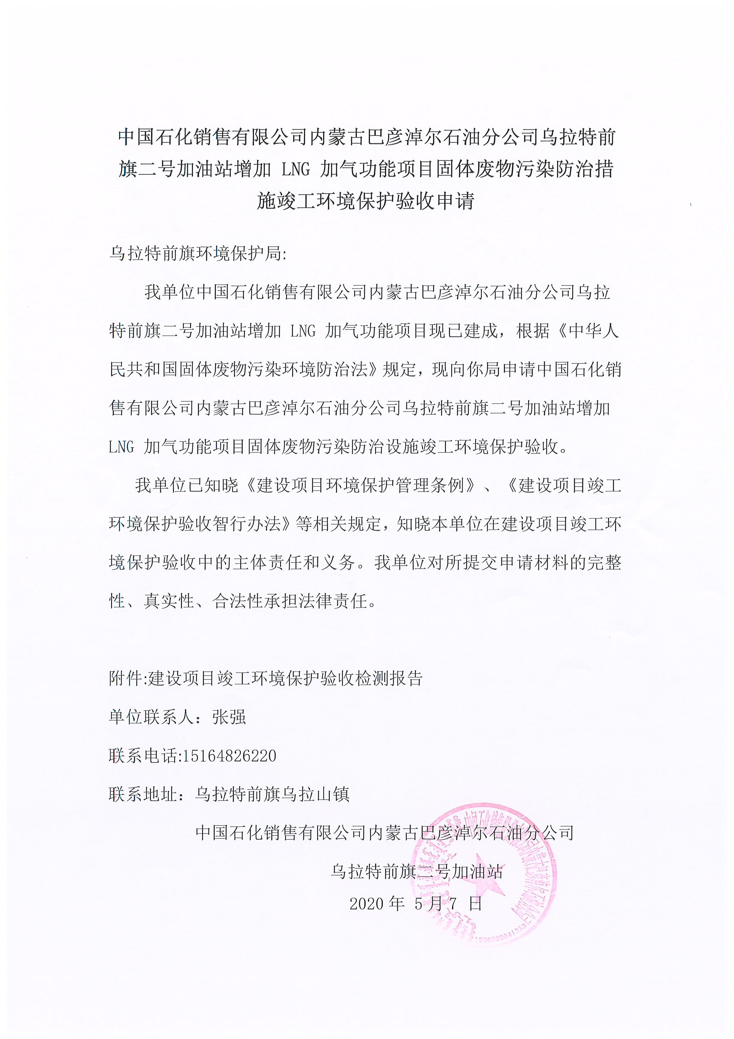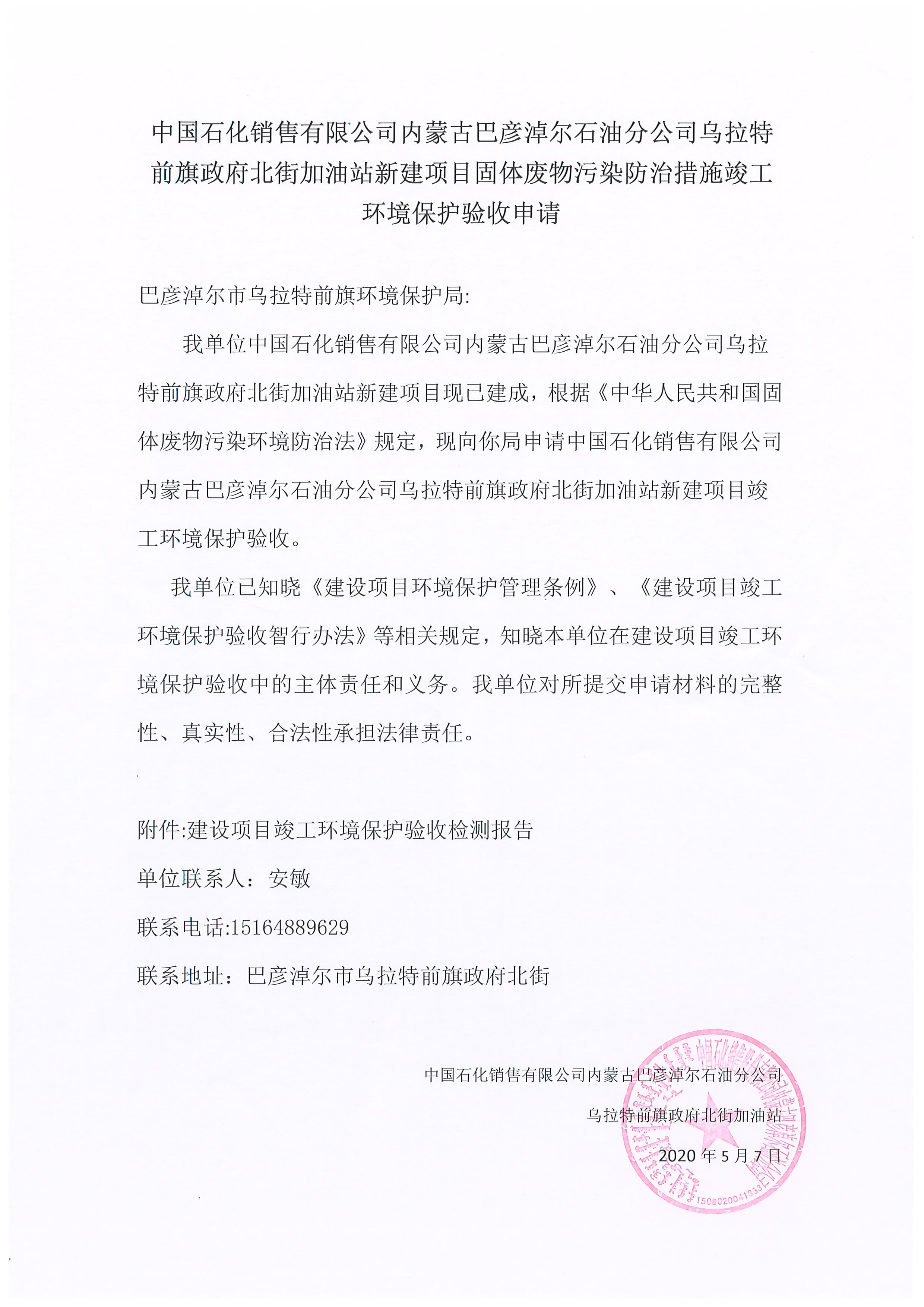 1.中国石化销售有限公司内蒙古巴彦淖尔石油分公司乌拉特前旗政府北街加油站验收检测报告、申请、自主验收意见、自主验收公示网址