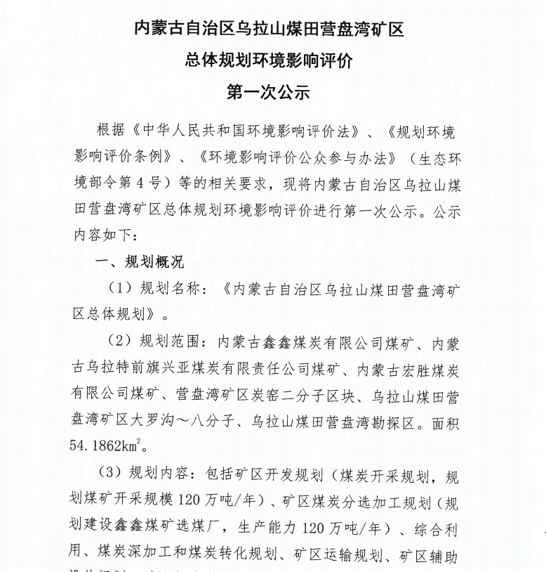 内蒙古自治区乌拉山煤田营盘湾矿区总体规划环境影响评价第一次公示
