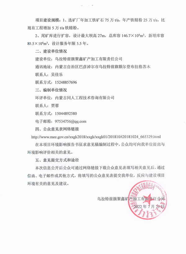 乌拉特前旗秉新矿业有限责任公司二选厂(乌拉特前旗聚鑫矿产加工有限责任公司)年产25万吨铁精粉尾矿干排技改项目环境影响评价首次信息公开