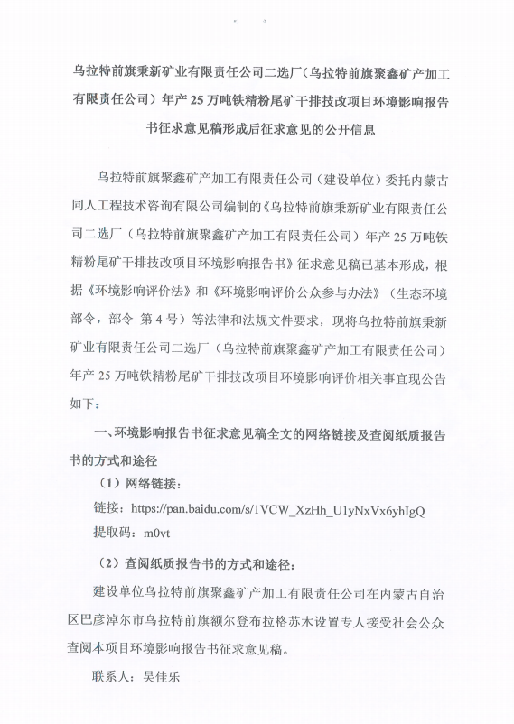 乌拉特前旗秉新矿业有限责任公司二选厂(乌拉特前旗聚鑫矿产加工有限责任公司)年产25万吨铁精粉尾矿干排技改项目环境影响报告书征求意见稿形成后征求意见的公开信息