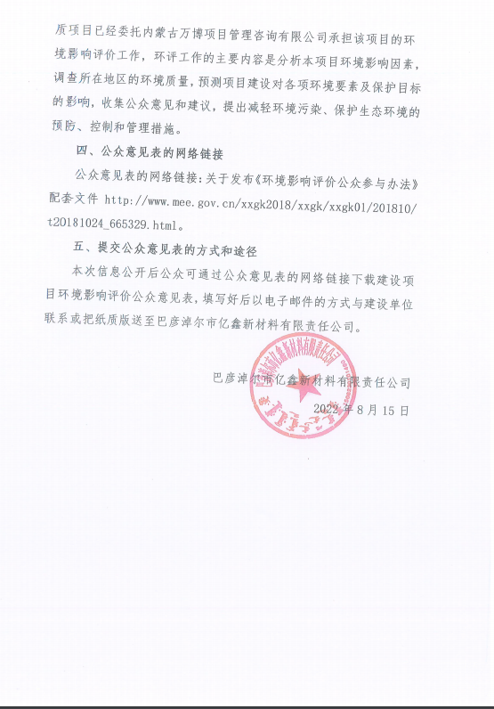 巴彦淖尔市亿鑫新材料有限责任公司年产2500吨稀土金属电解质项目环境影响评价公众参与第一次公示