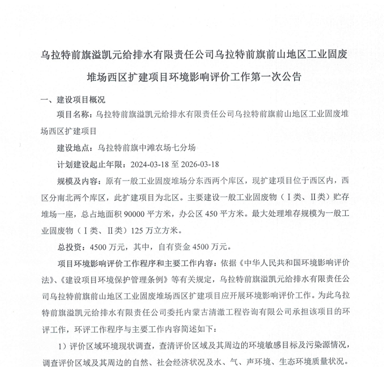 乌拉特前旗溢凯元给排水有限责任公司乌拉特前旗前山地区工业固废堆场西区扩建项目环境影响评价工作第一次公告