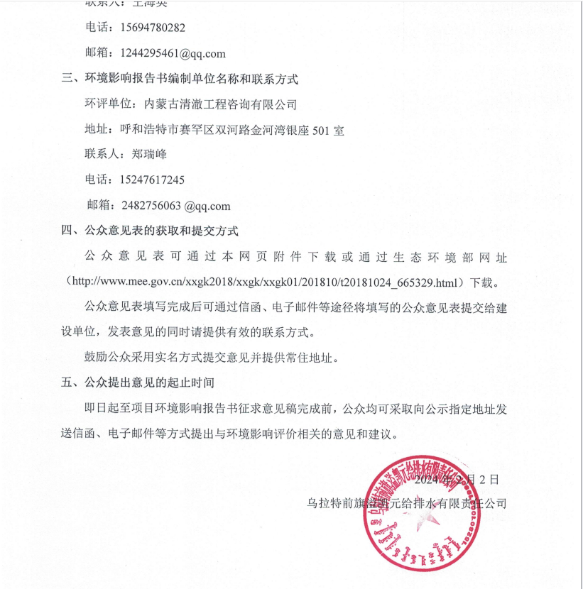 巴彦淖尔市生态环境局乌拉特前旗分局2024年2月5日拟审批项目的公示