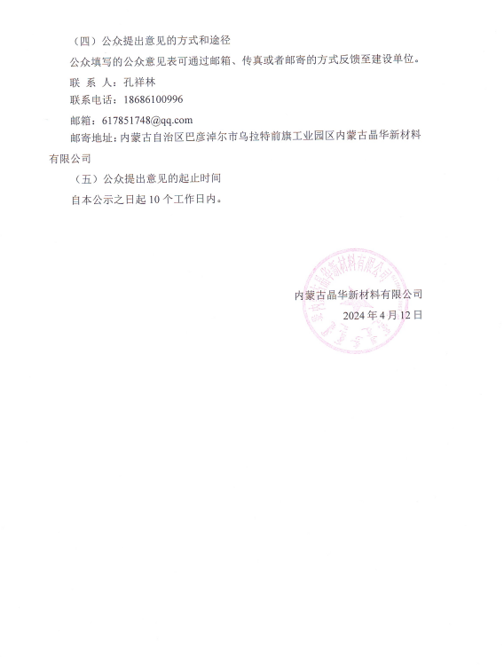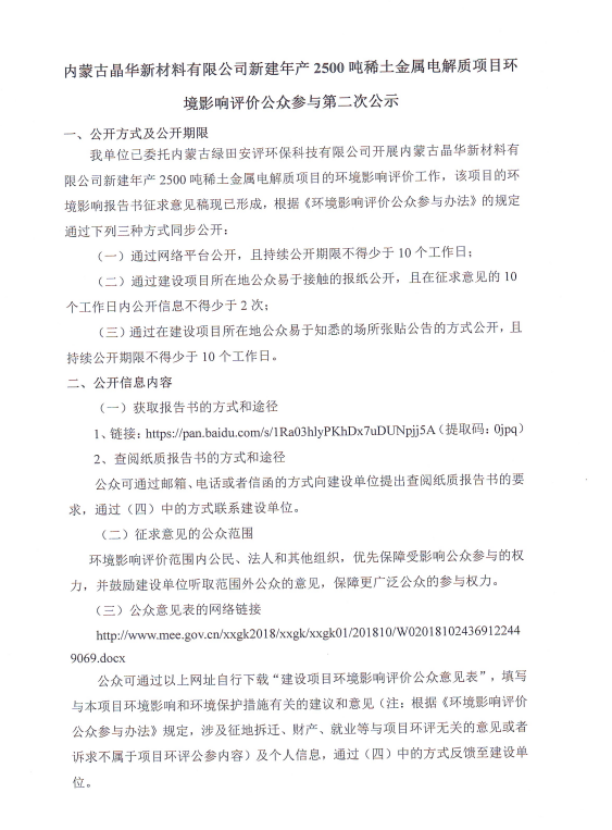 内蒙古晶华新材料有限公司新建年产2500吨稀土金属电解质项目环境影响评价公众参与第二次公示