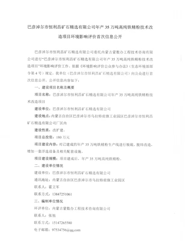 巴彦淖尔市恒利昌矿石精选有限公司年产35万吨高纯铁精粉技术改造项目环境影响评价首次信息公开