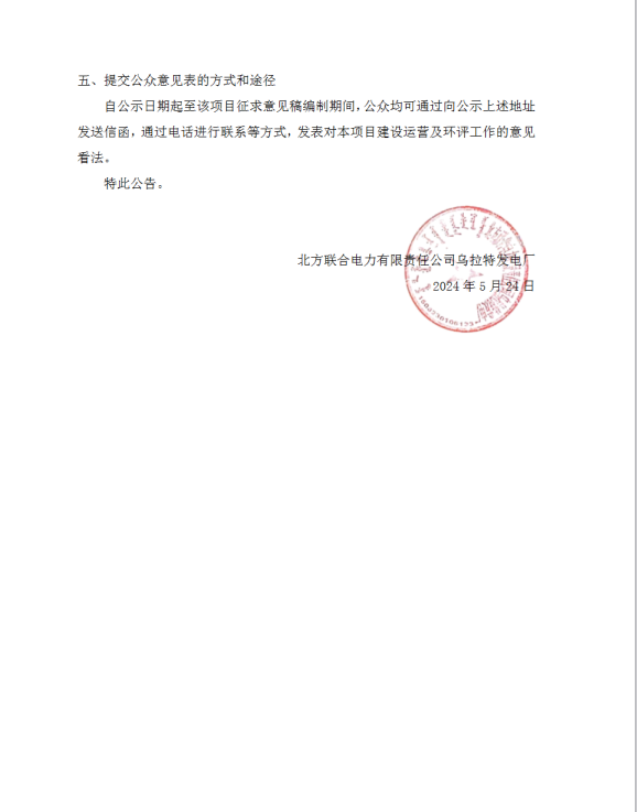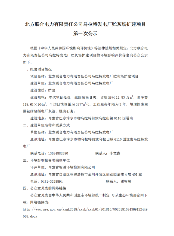 北方联合电力有限责任公司乌拉特发电厂贮灰场扩建项目第一次公示