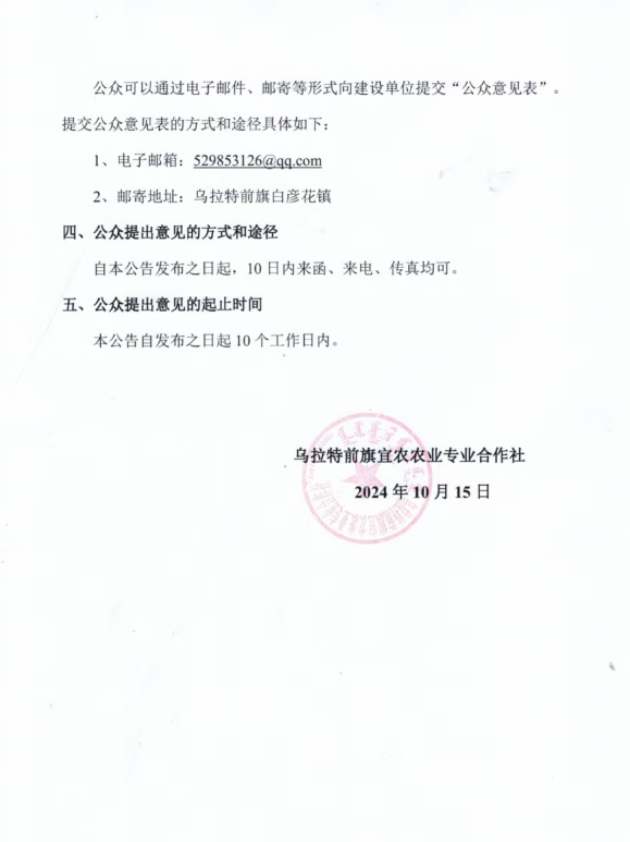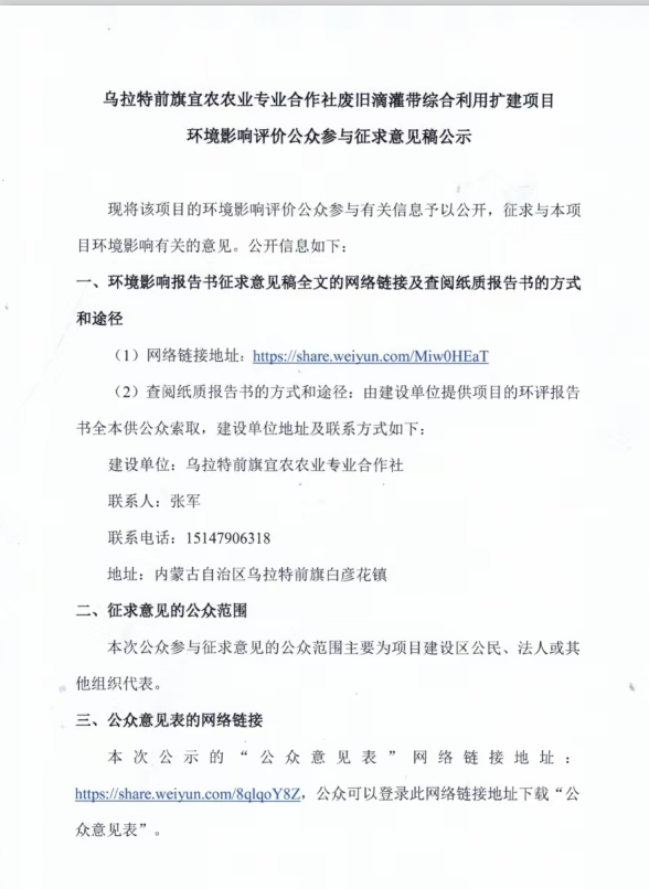 乌拉特前旗宜农农业专业合作社废旧滴灌带综合利用扩建项目环境影响评价公众参与征求意见稿公示