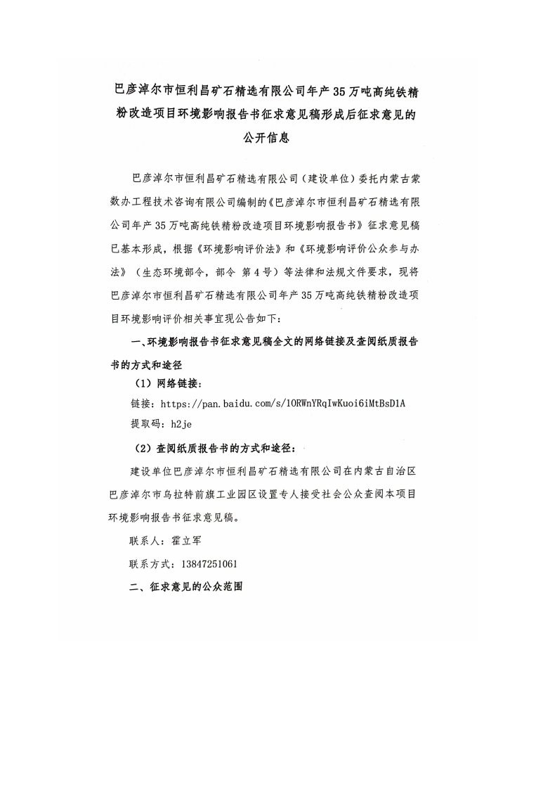 巴彦淖尔市恒利昌矿石精选有限公司年产35万吨高纯铁精粉改造项目环境影响报告书征求意见稿形成后征求意见的公开信息