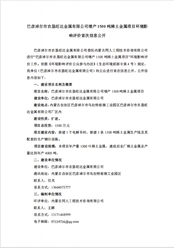 巴彦淖尔市农垦旺达金属有限公司增产1500吨稀土金属项目环境影响评价首次信息公开