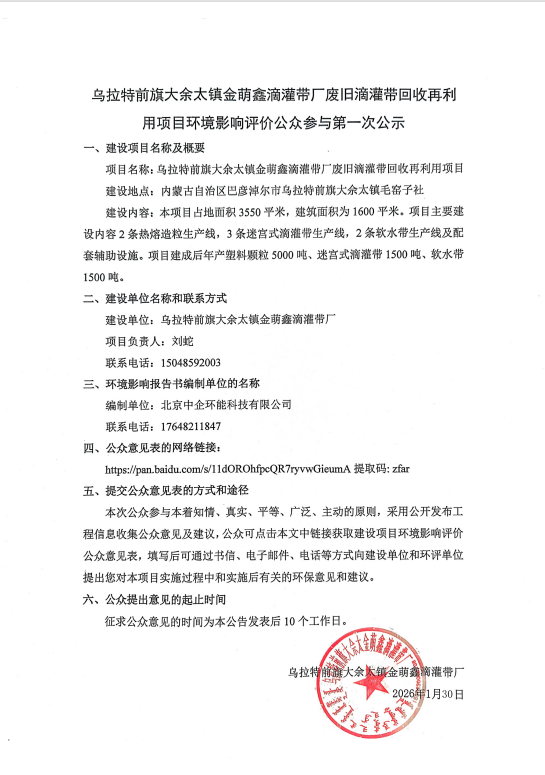 乌拉特前旗大佘太镇金萌鑫滴灌带厂废旧滴灌带回收再利用项目环境影响评价公众参与第一次公示