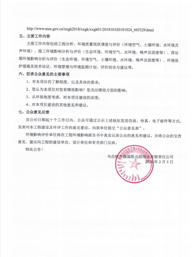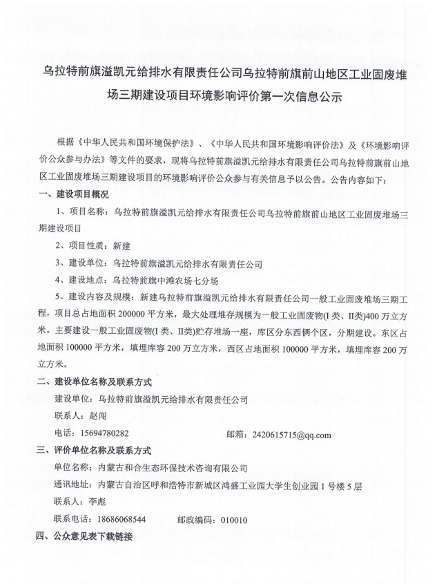乌拉特前旗溢凯元给排水有限责任公司乌拉特前旗前山地区工业固废堆场三期建设项目环境影响评价第一次信息公示