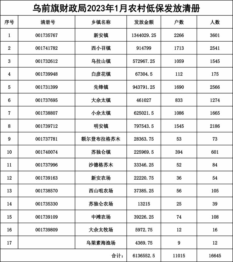 乌拉特前旗财政局2023年6月城镇低保发放清册