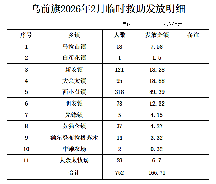 【临时救助】乌前旗2026年2月临时救助发放明细