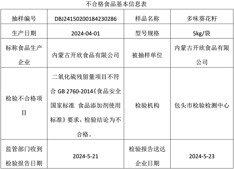 一、我局对内蒙古开欣食品有限公司2024年4月1日生产的多味葵花籽的留样进行了检验,经委托内蒙古华瑞检验检测有限公司检验后,显示该产品的留样,二氧化硫残留量项目符合GB 2760-2014《食品安全国家标准 食品添加剂使用标准》要求,检验结论为合格。
