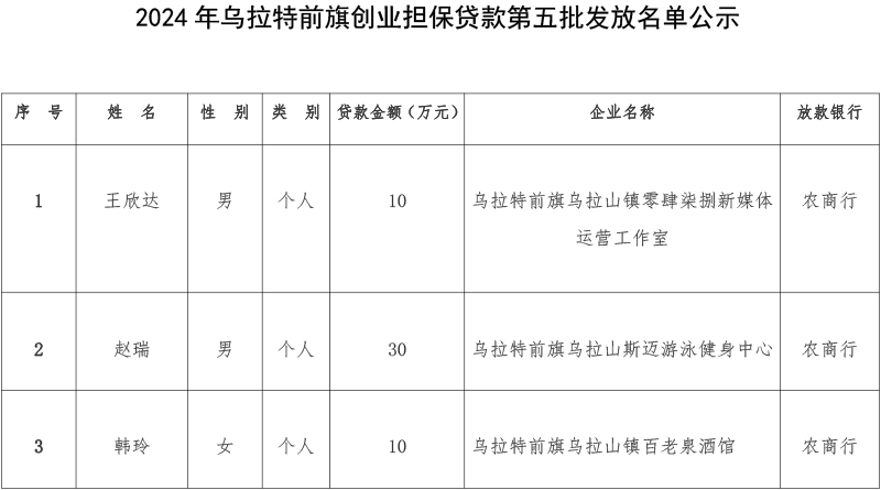 关于乌拉特前旗创业担保贷款第五批发放名单的公示
