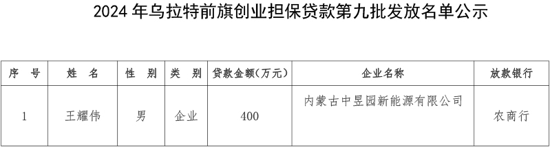 关于乌拉特前旗创业担保贷款第九批发放名单的公示