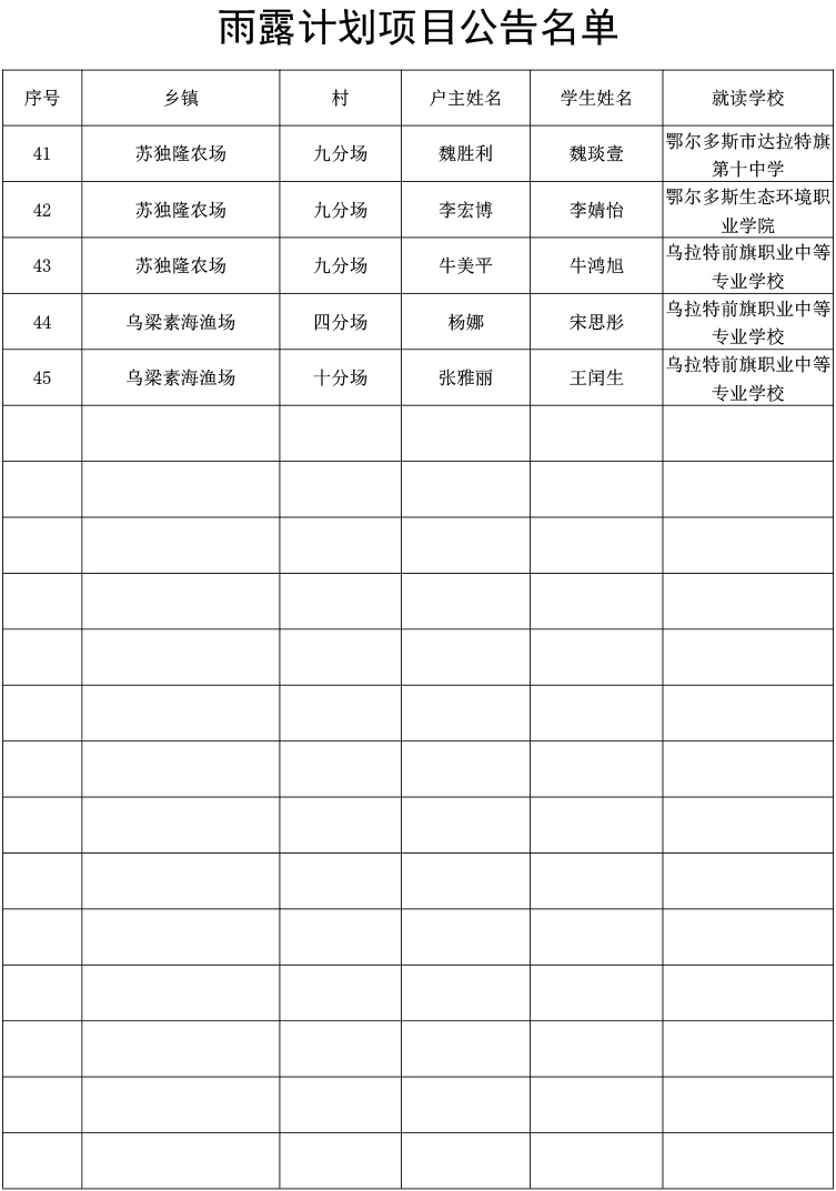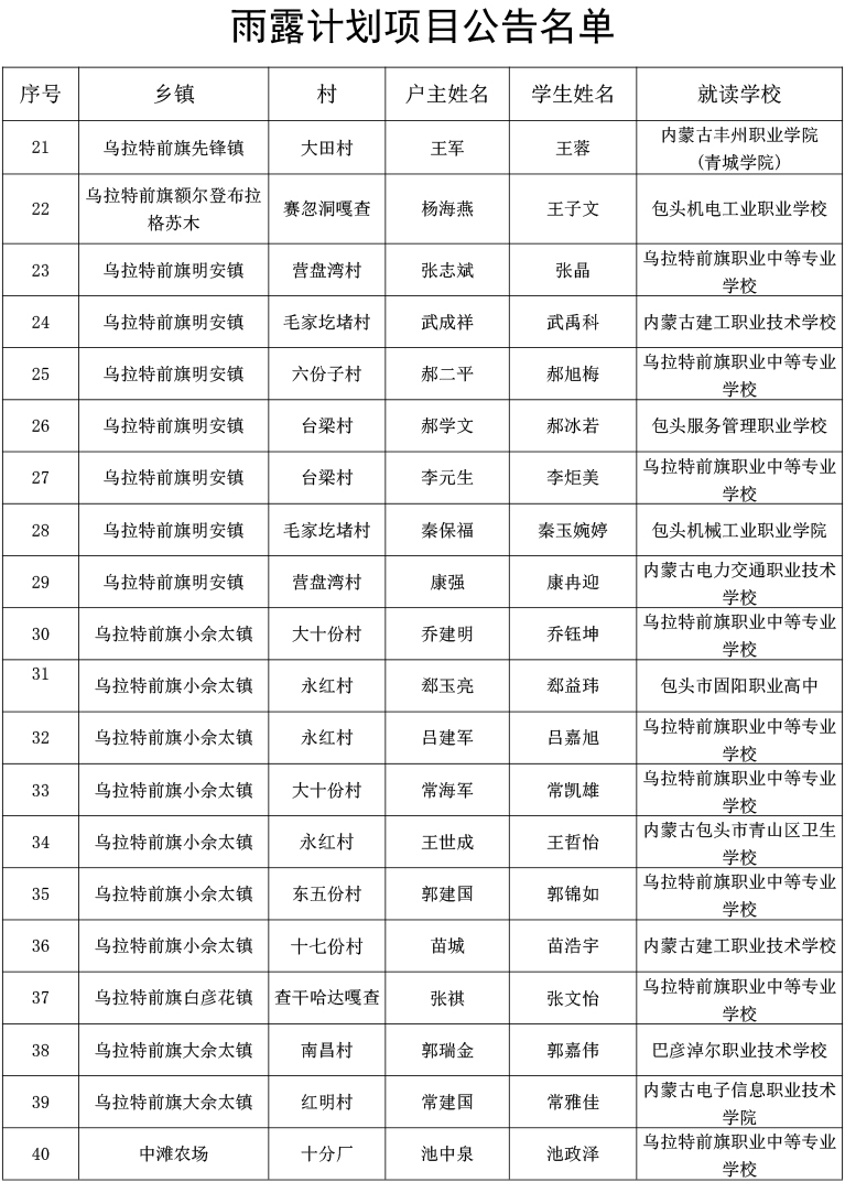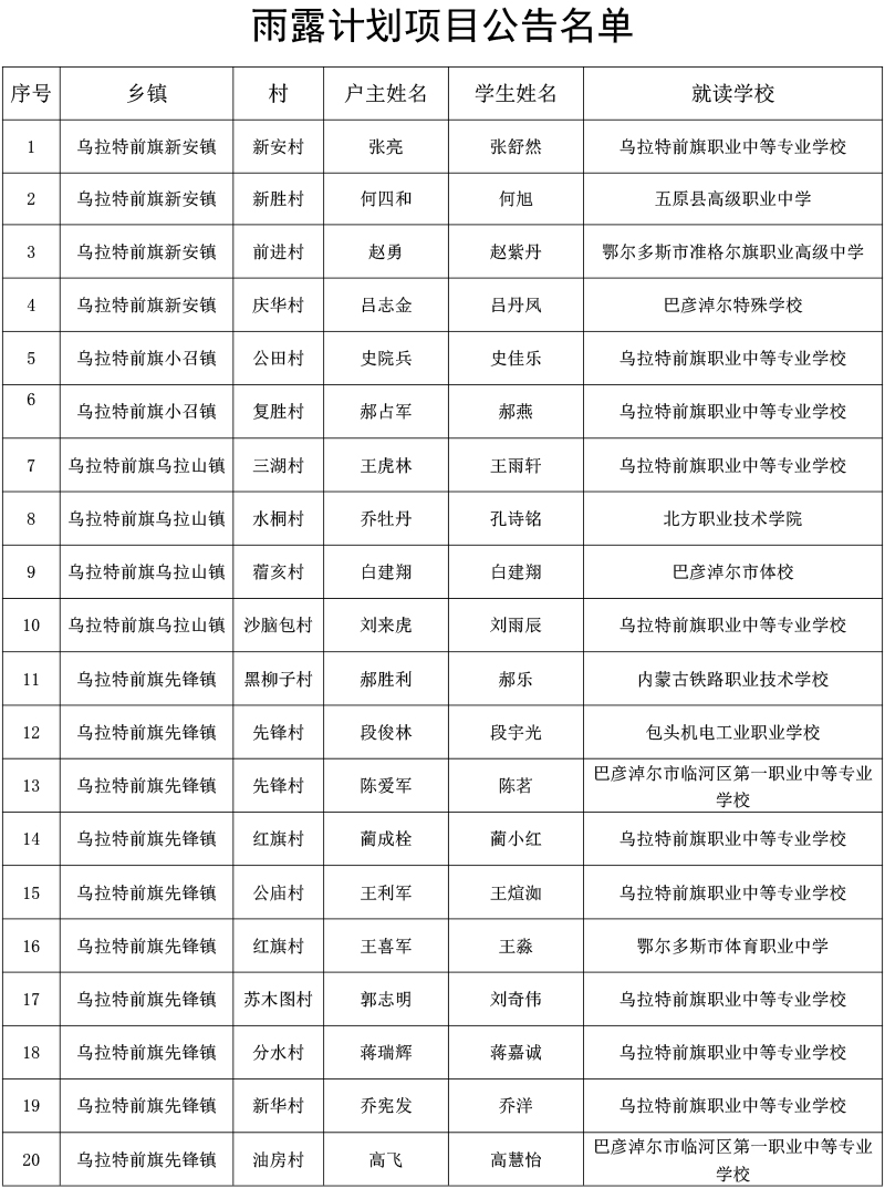 为加强对衔接资金的管理和监督,提高衔接资金使用透明度,切实维护群众利益,经各级审核、村级公示,结合我旗实际,现将2024年春季雨露计划项目补助情况予以公告,公告期为10天(2024年5月20日至2024年5月29日)。公告期间,如反映公告内容存在问题,请在公告期内向乌拉特前旗乡村振兴局提出意见。