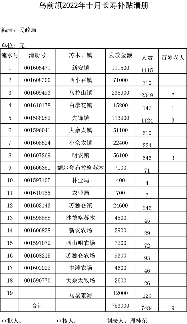 乌拉特前旗2022年十月长寿补贴清册