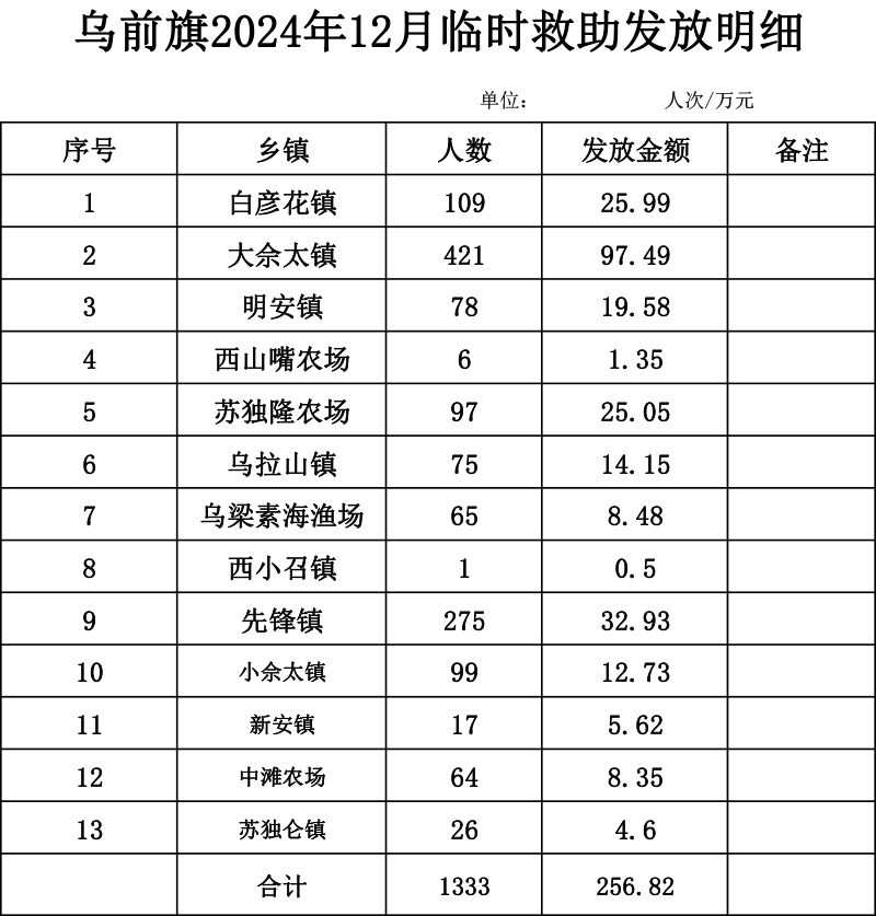 【临时救助】乌拉特前旗2024年12月发放明细