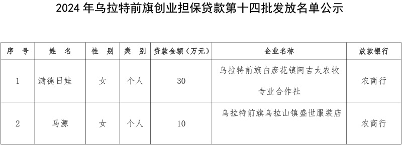 关于乌拉特前旗创业担保贷款第十四批发放名单的公示