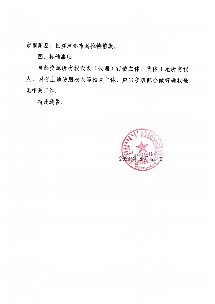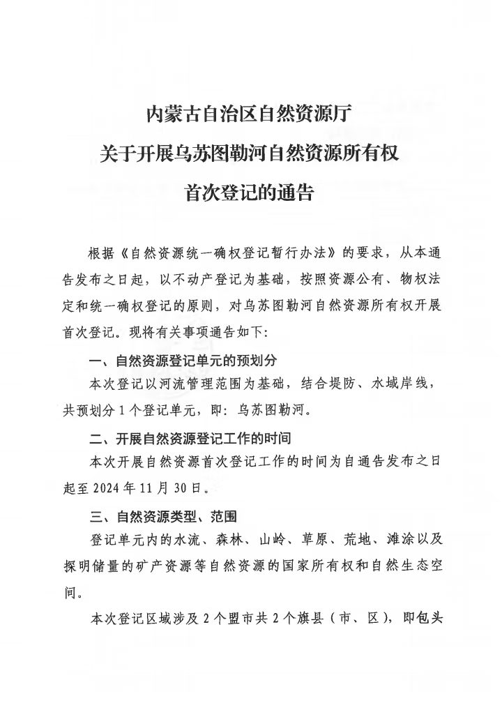 内蒙古自治区自然资源厅关于开展乌苏图勒河自然资源所有权首次登记的通告