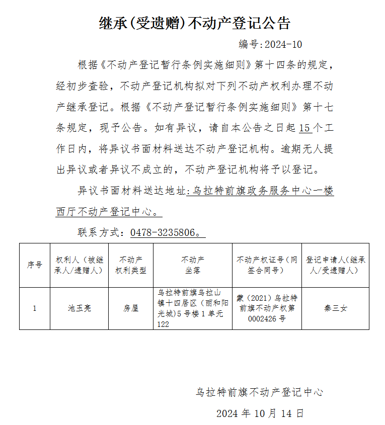 秦三女继承(受遗赠)不动产登记公告