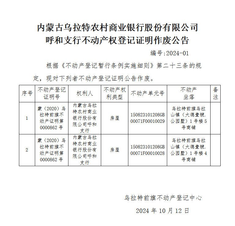 内蒙古乌拉特农村商业银行股份有限公司呼和支行不动产权登记证明作废公告