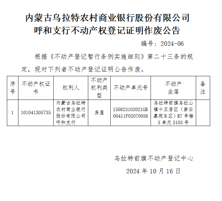 内蒙古乌拉特农村商业银行股份有限公司呼和支行不动产权登记证明作废公告
