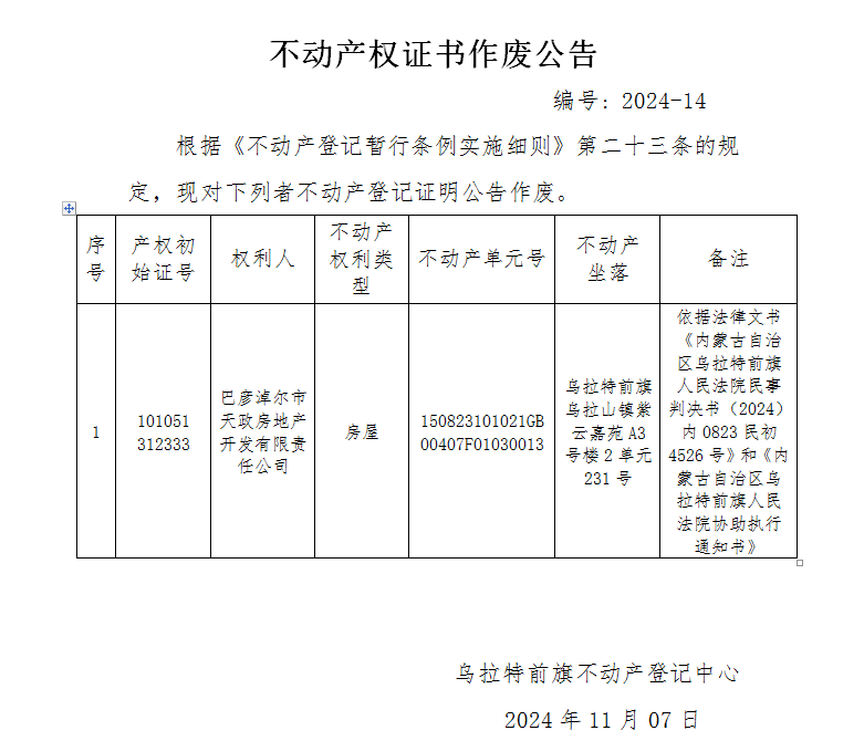 巴彦淖尔市天政房地产开发有限责任公司产不动产权证书作废公告