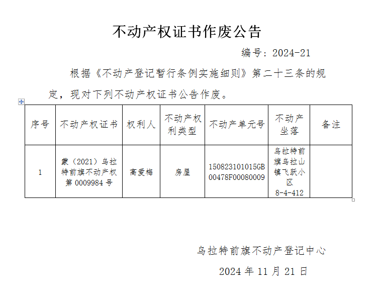 高爱梅不动产权证书作废公告