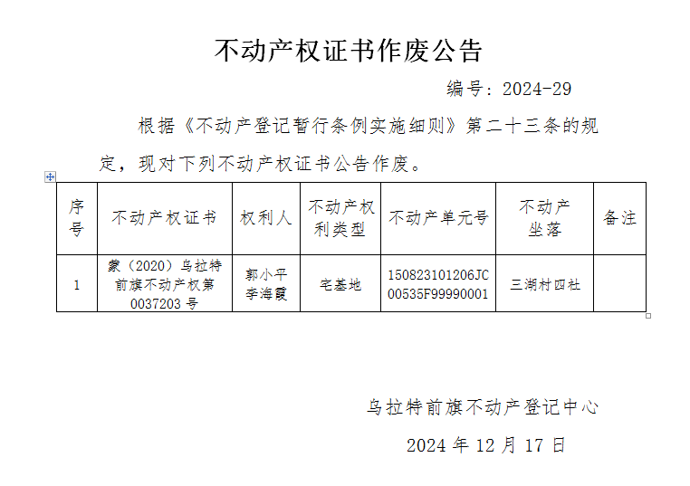 郭小平、李海霞不动产权证书作废公告