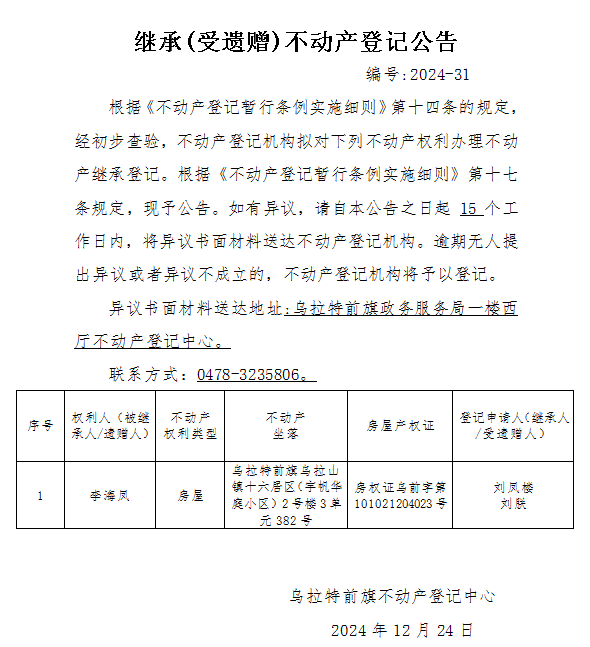 刘凤楼、刘朕继承(受遗赠)不动产登记公告