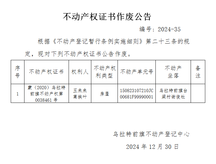 王福祥不动产权证书作废公告