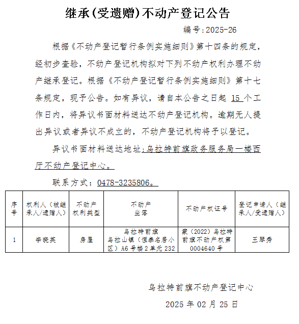 来源:乌拉特前旗不动产登记中心