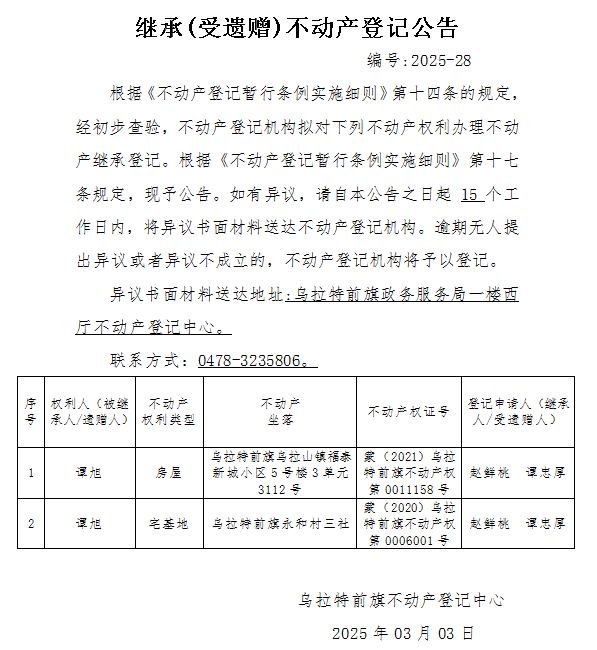 赵鲜桃 谭忠厚继承(受遗赠)不动产登记公告