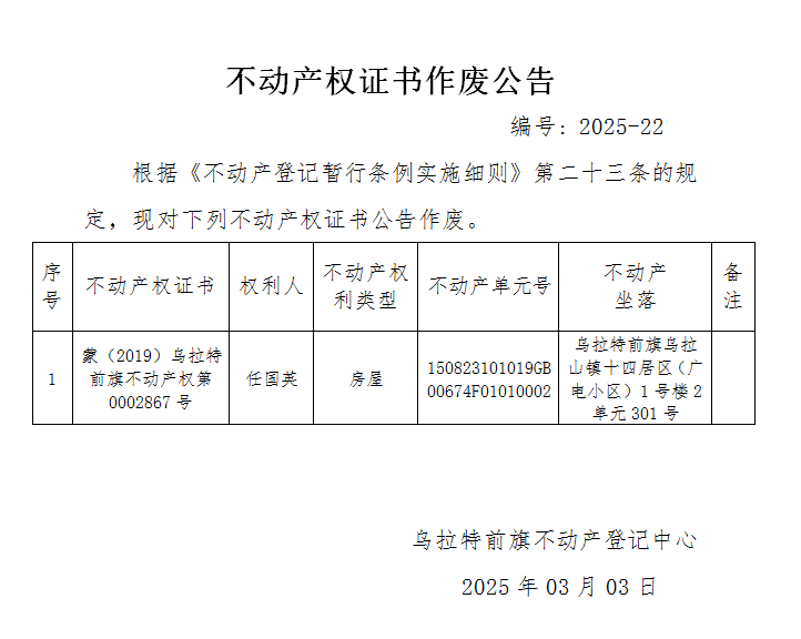 任国英不动产权证书作废公告