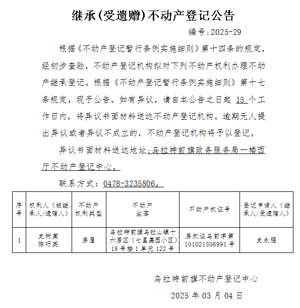 史永强继承(受遗赠)不动产登记公告