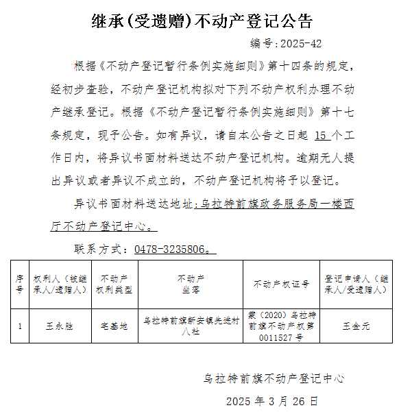 王金元继承(受遗赠)不动产登记公告