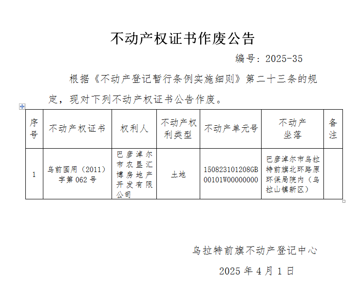 巴彦淖尔市农垦汇博房地产开发有限公司不动产权证书作废公告