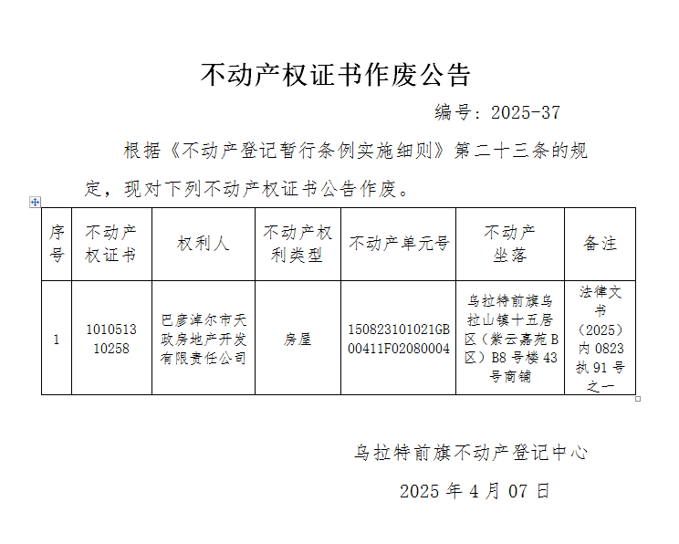 巴彦淖尔市天政房地产开发有限责任公司不动产权证书作废公告