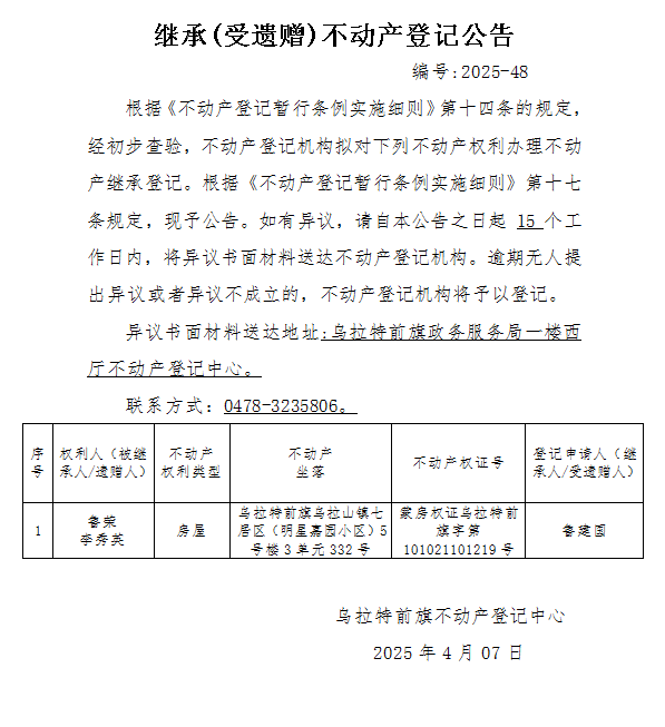 鲁建国继承(受遗赠)不动产登记公告