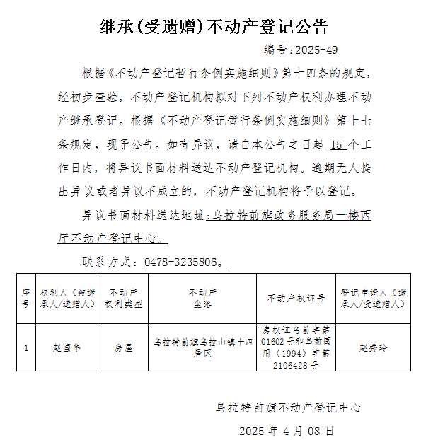 来源:乌拉特前旗不动产登记中心
