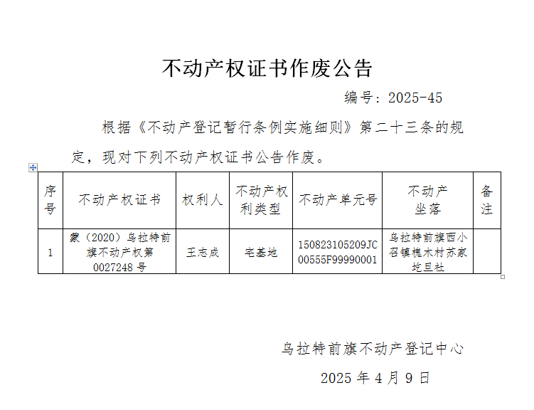 王志成不动产权证书作废公告