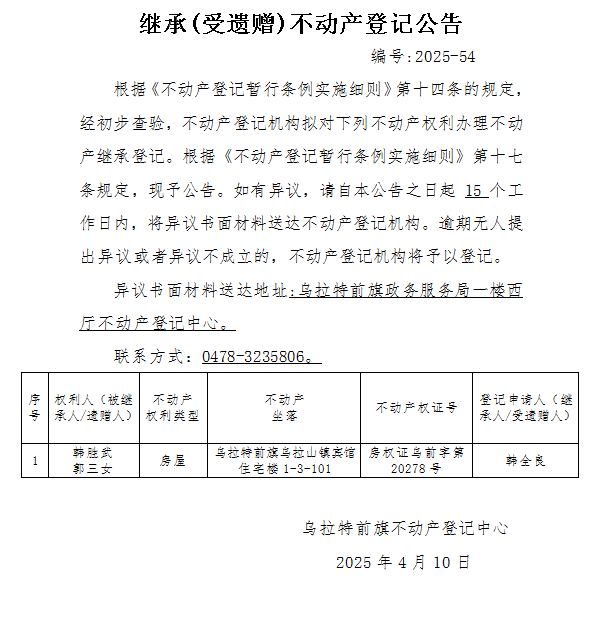 韩全良继承(受遗赠)不动产登记公告