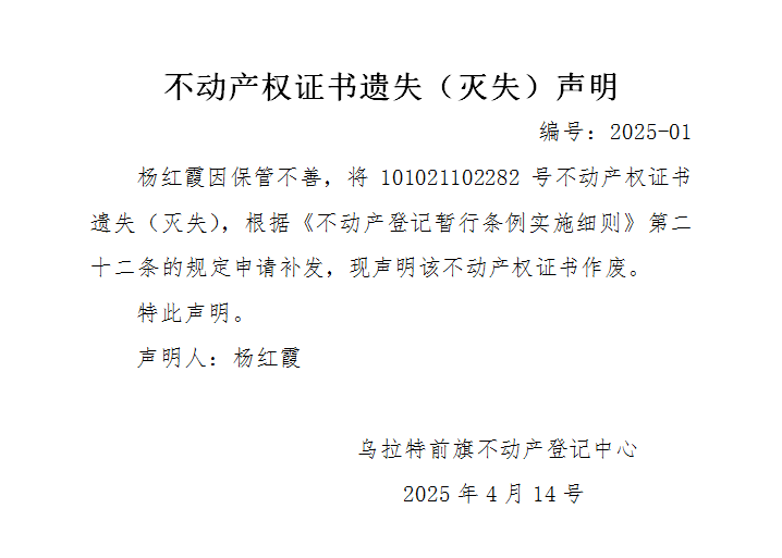 杨红霞不动产权证书遗失(灭失)声明