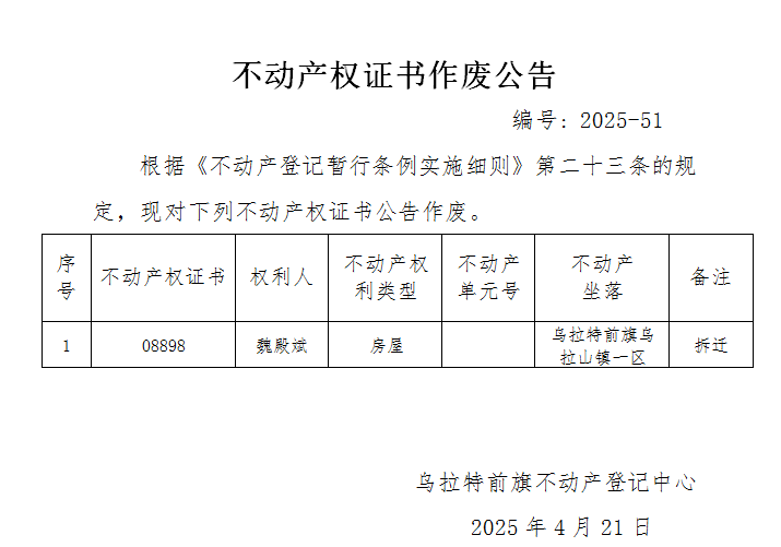 魏殿斌不动产权证书作废公告